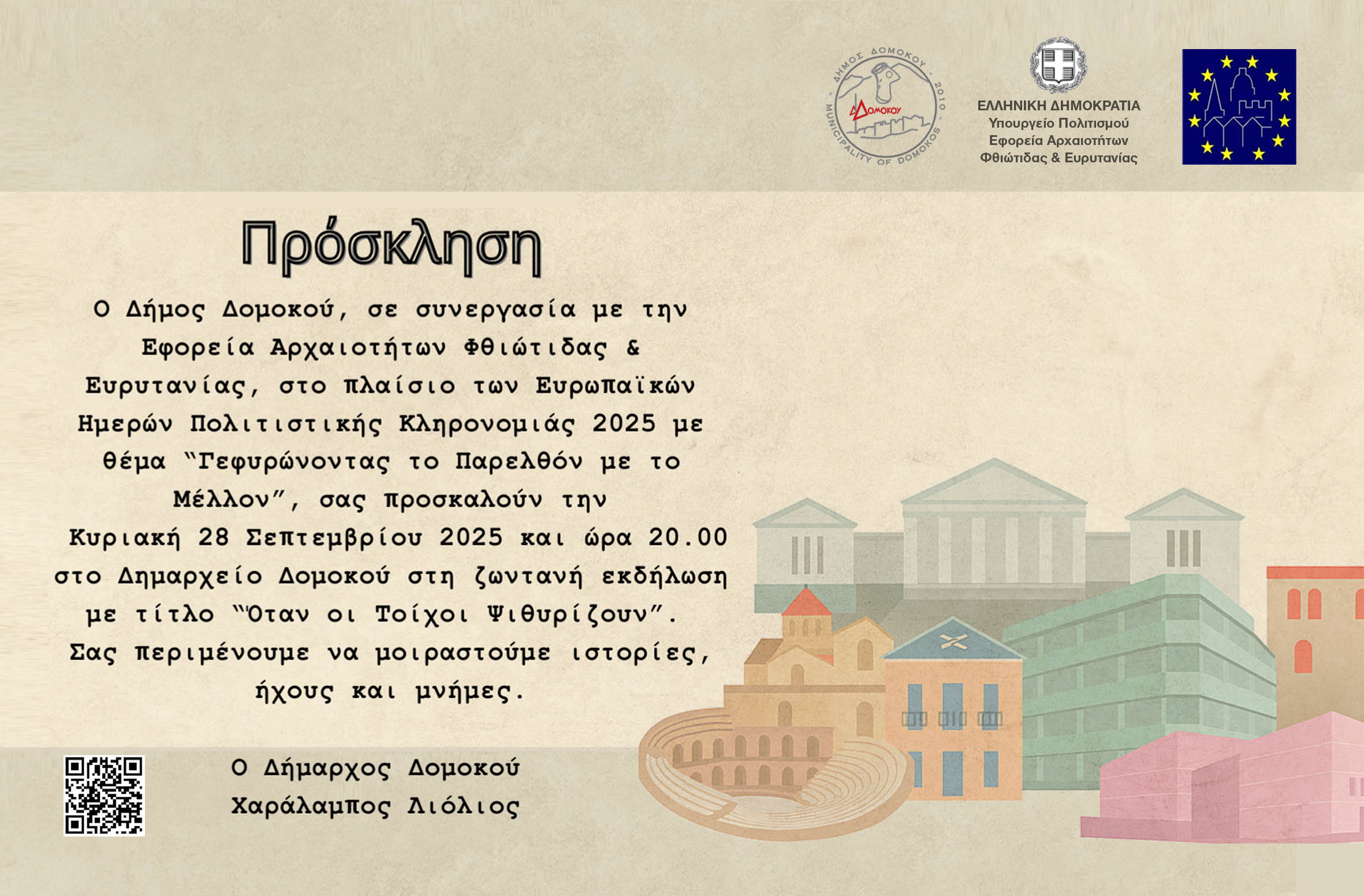 Για τον εορτασμό των «Ευρωπαϊκών Ημερών Πολιτιστικής Κληρονομιάς 2025», ο Δήμος Δομοκού διοργανώνει, σε συνεργασία με την Εφορεία Αρχαιοτήτων Φθιώτιδας και Ευρυτανίας, την Ιερά Μητρόπολη Φθιώτιδος, την Υπηρεσία Νεωτέρων Μνημείων και Τεχνικών Έργων Θεσσαλίας και Στερεάς Ελλάδας και το Οινοποιείο Οικογένειας Γκιρλέμη, μια σειρά από 11 ψηφιακές δράσεις: