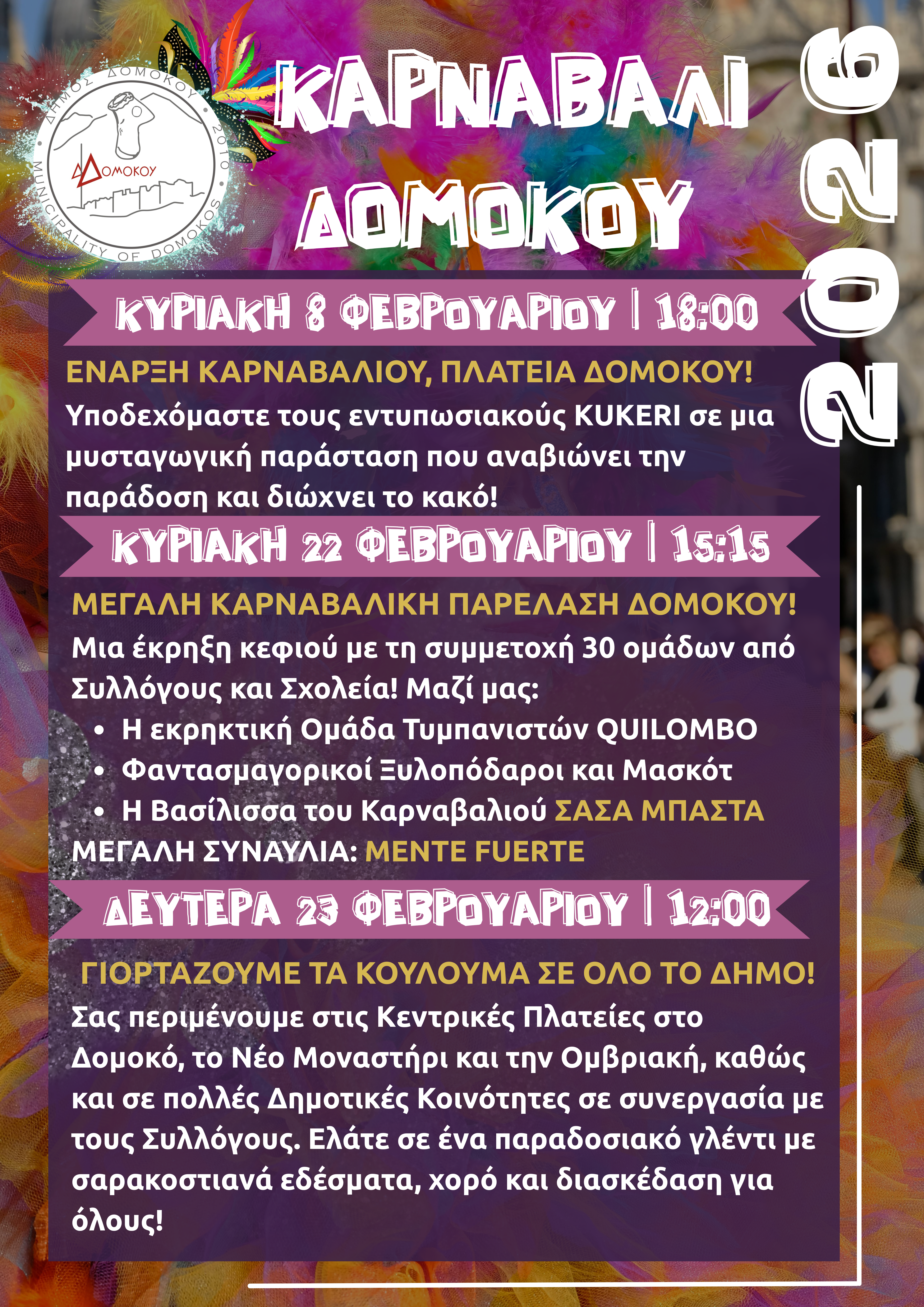 Την Κυριακή 22 Φεβρουαρίου στις 15.15, ο Δομοκός μεταμορφώνεται σε ένα ατελείωτο πάρτι με 30 ομάδες, την εκρηκτική ενέργεια των Quilombo και τους εντυπωσιακούς ξυλοπόδαρους να στρώνουν το χαλί για τη Βασίλισσα Σάσα Μπάστα και το μεγάλο live του Mente Fuerte στην Κεντρική Πλατεία του Δομοκού!